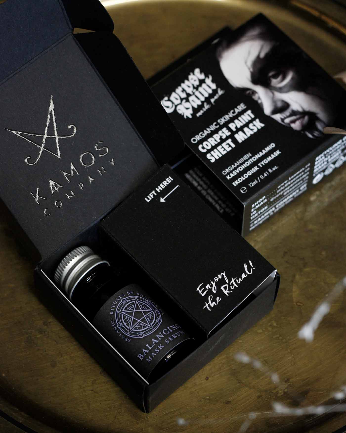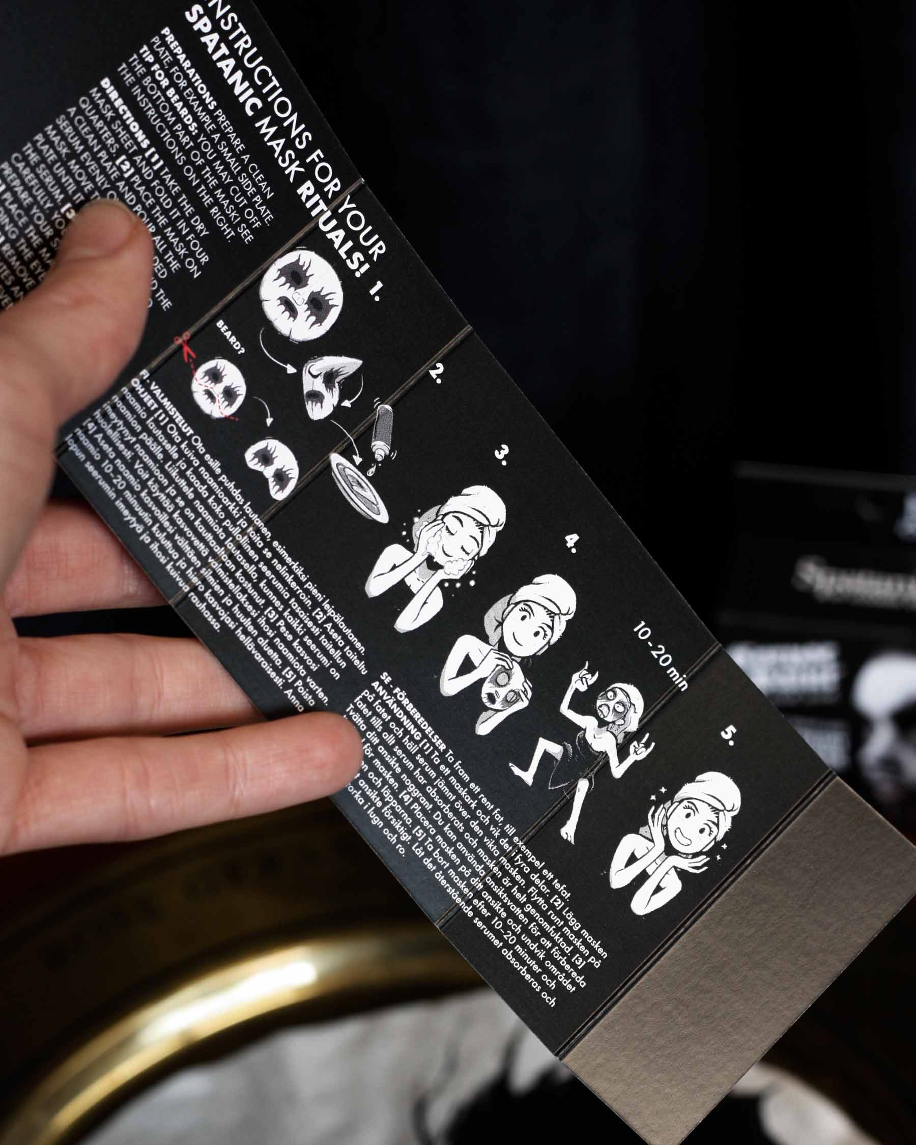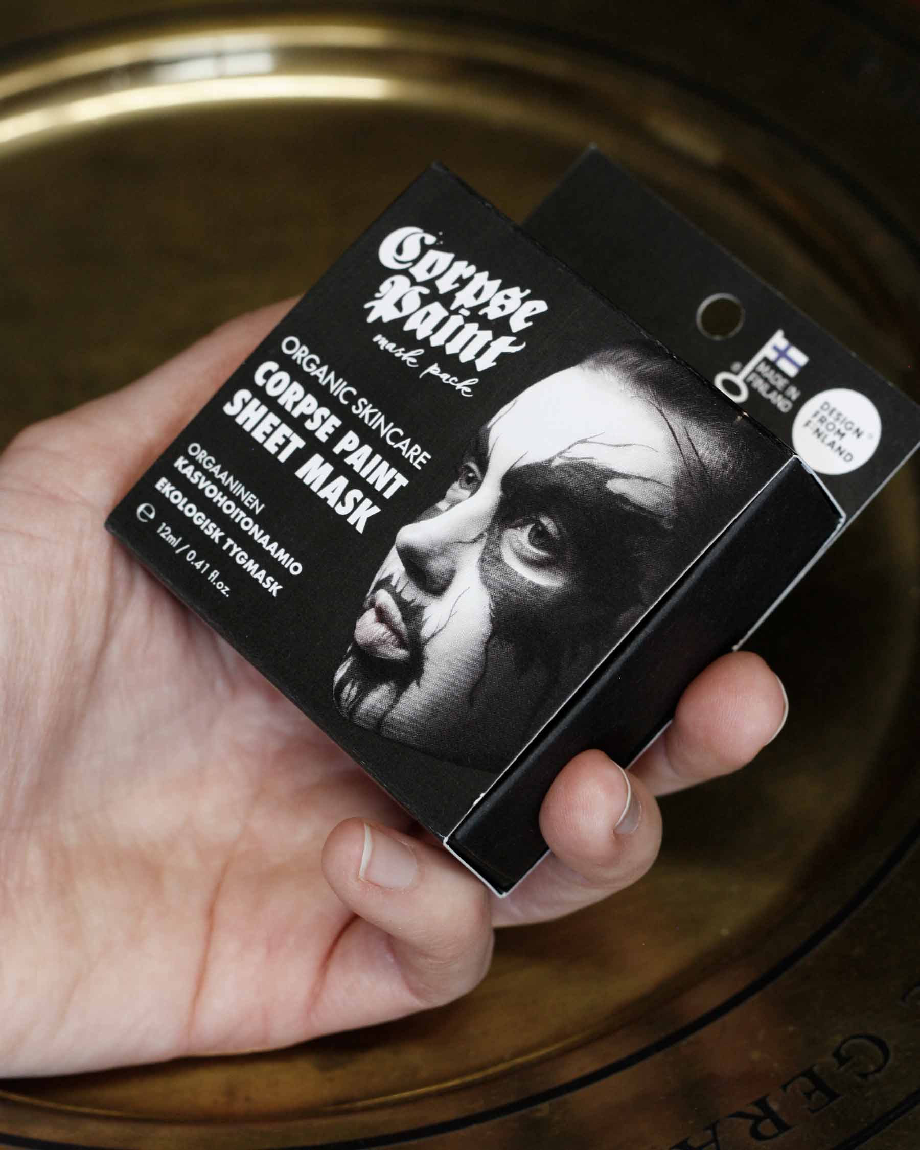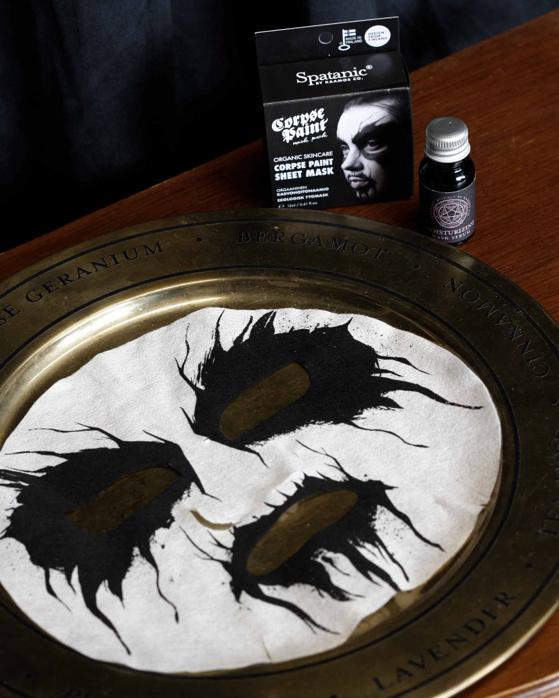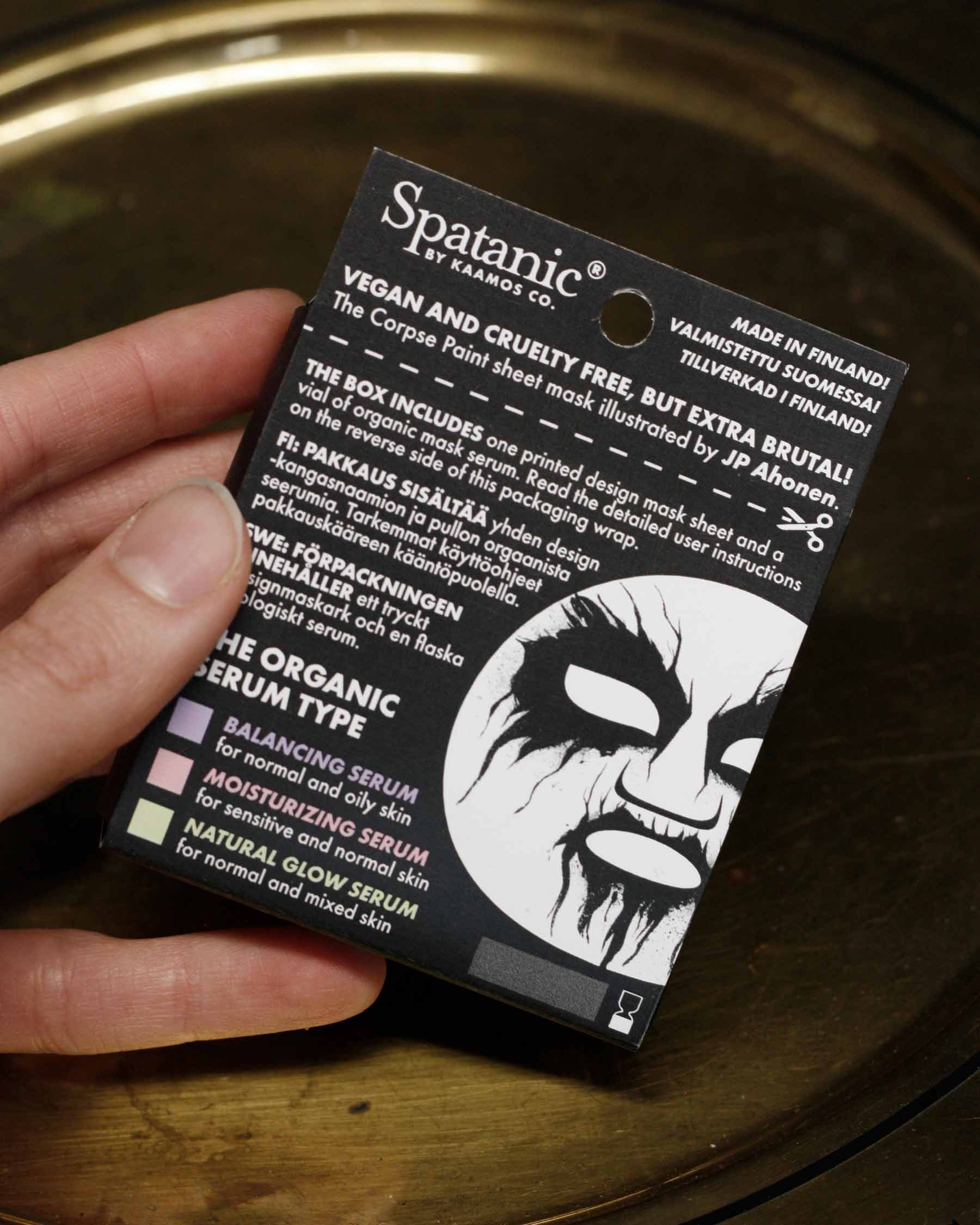 Our original Corpse Paint sheet mask is designed by Finnish cartoonist JP Ahonen (Belzebubs, Perkeros, Villimpi Pohjola, etc).
