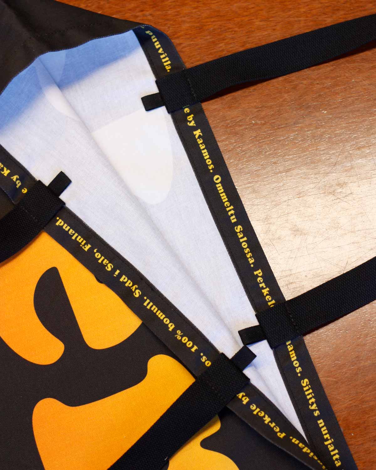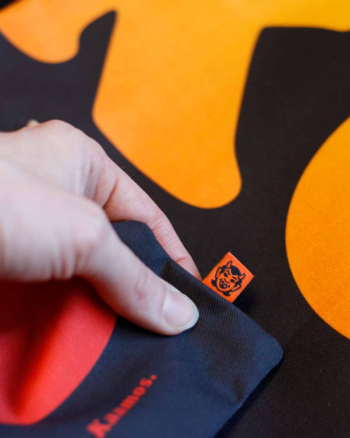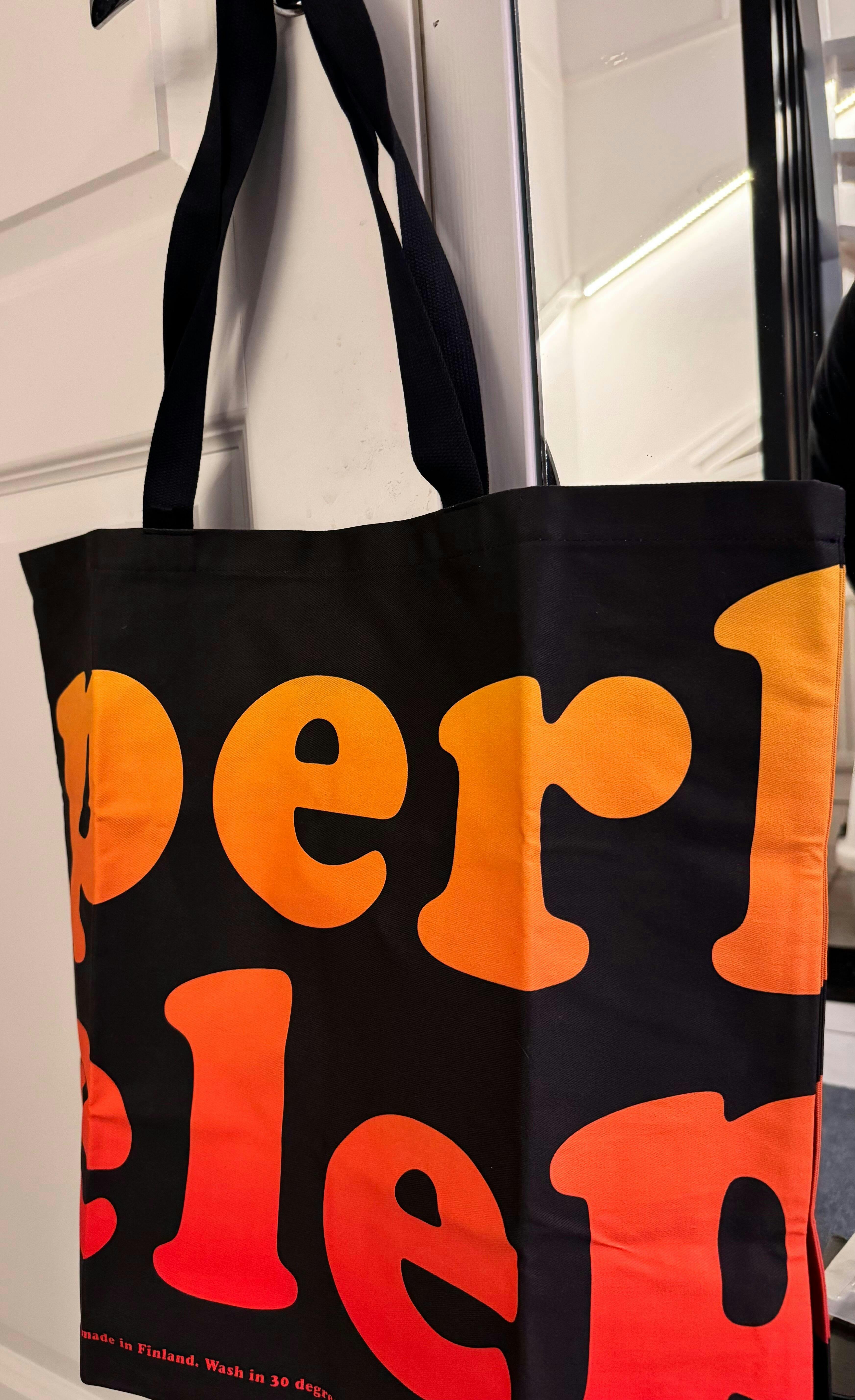 This oversized fabric tote bag is hand-sewn in Salo, Finland, in collaboration with a local partner. The Perkele fabric is an exclusive Kaamos design. The bag was created originally as a playful parody of the Finnish tote bag craze and has now transformed to be more edgy than ever!