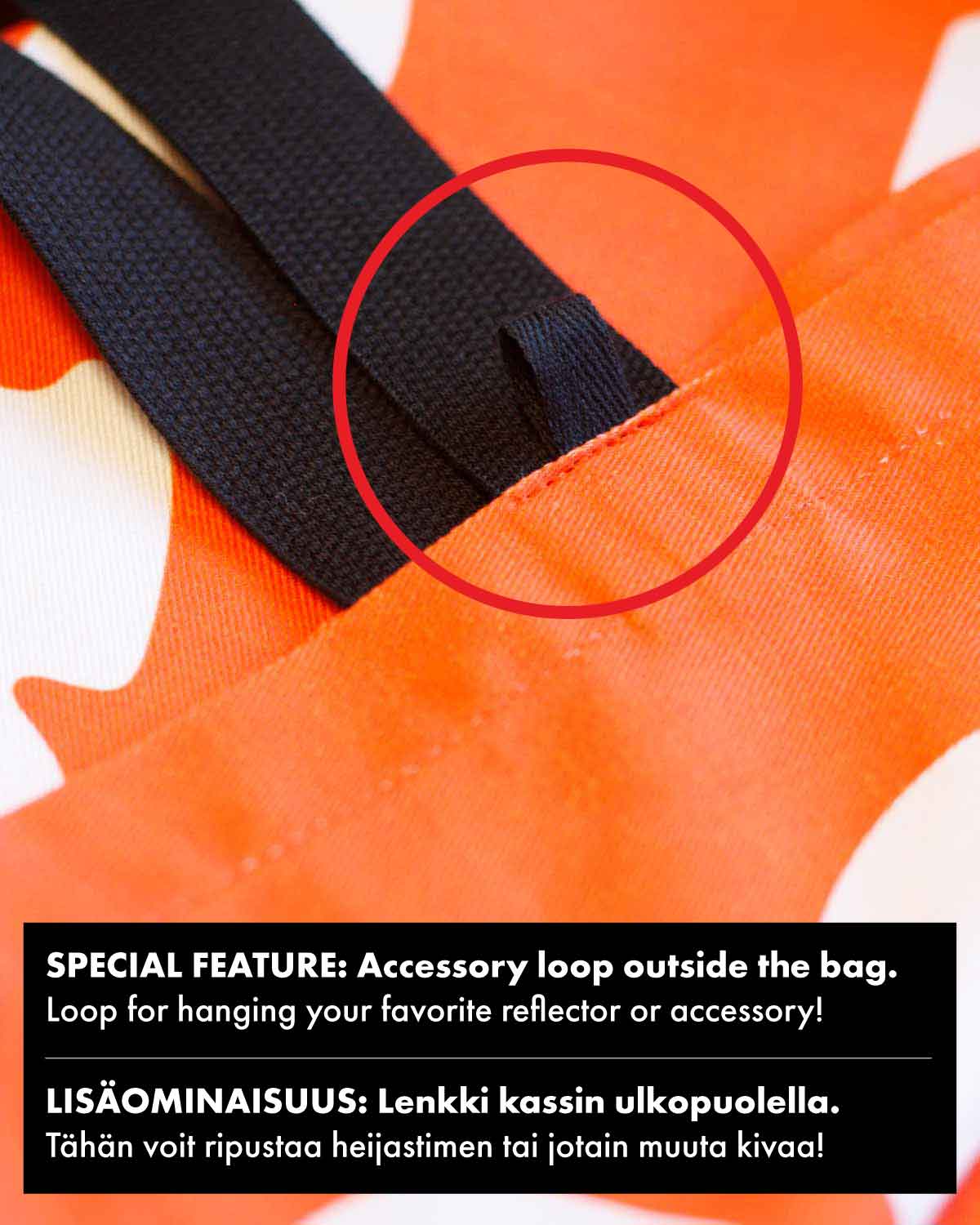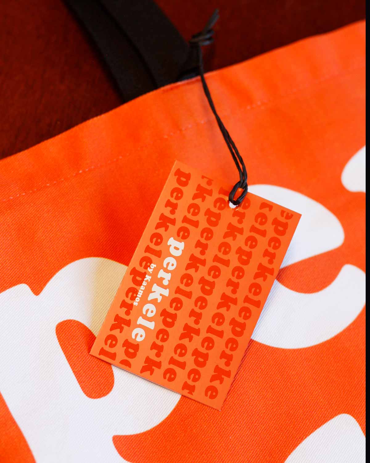 This oversized fabric tote bag is hand-sewn in Salo, Finland, in collaboration with a local partner. The Perkele fabric is an exclusive Kaamos design. The bag was created originally as a playful parody of the Finnish tote bag craze and has now transformed to be more edgy than ever!