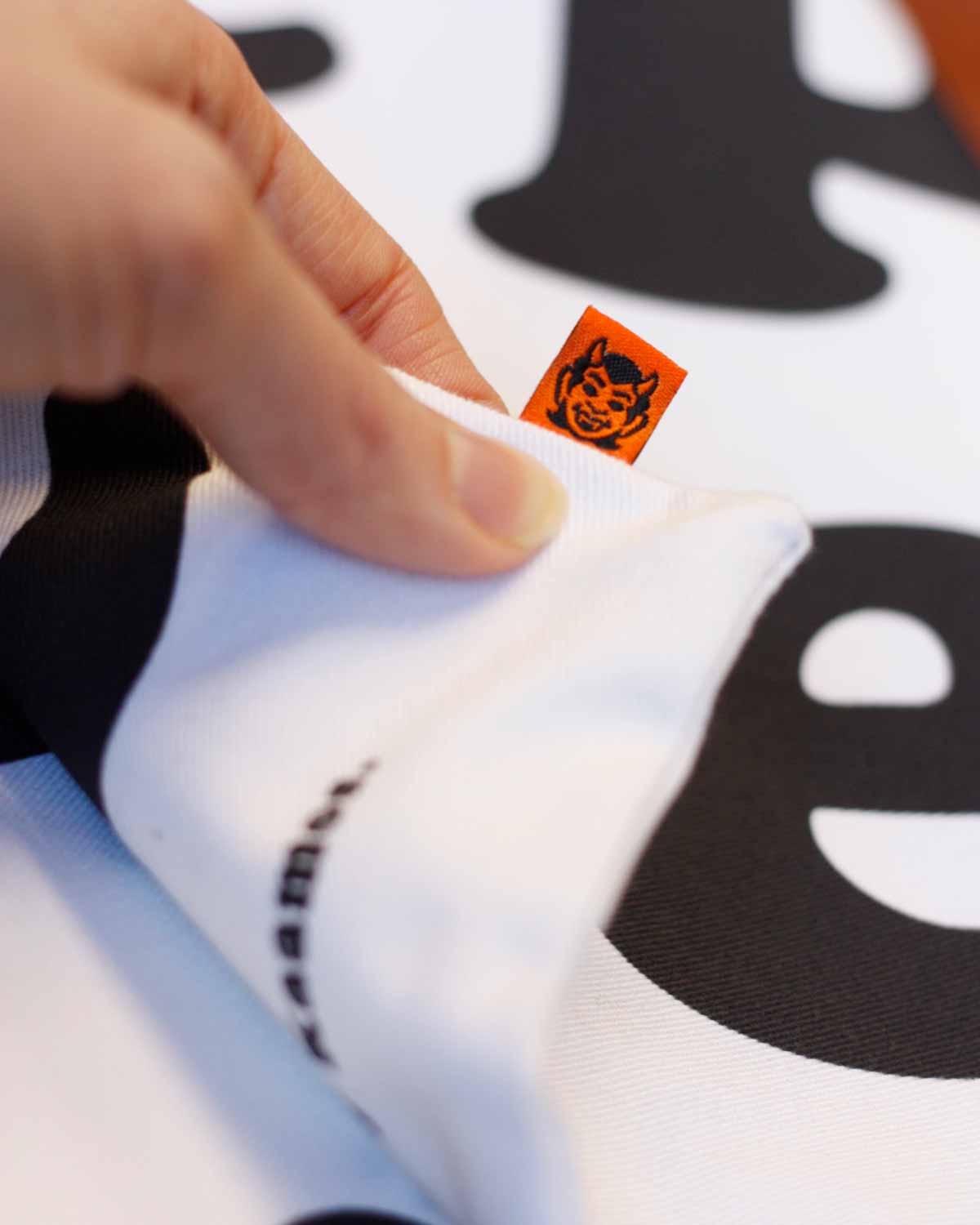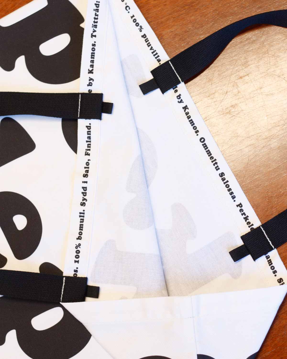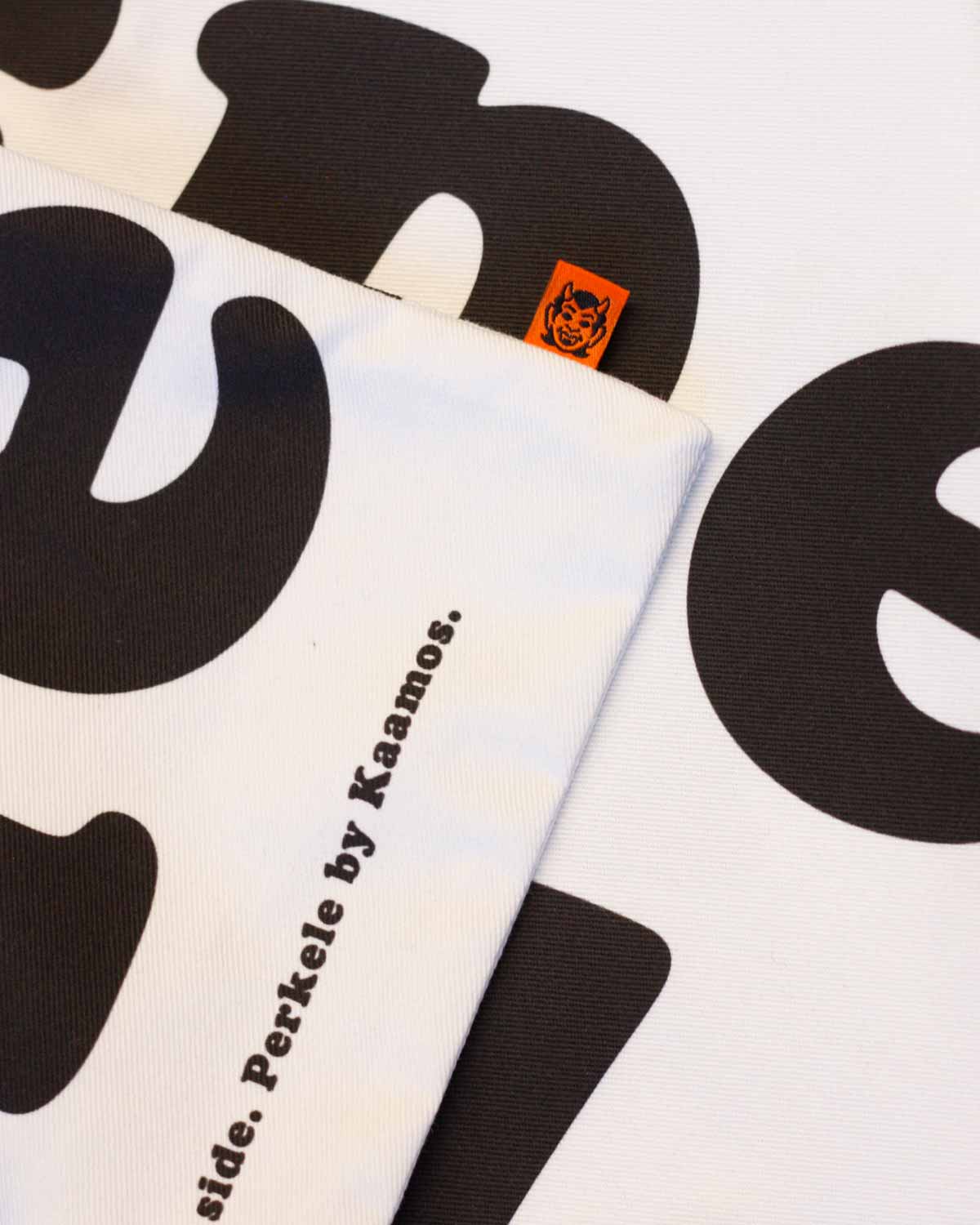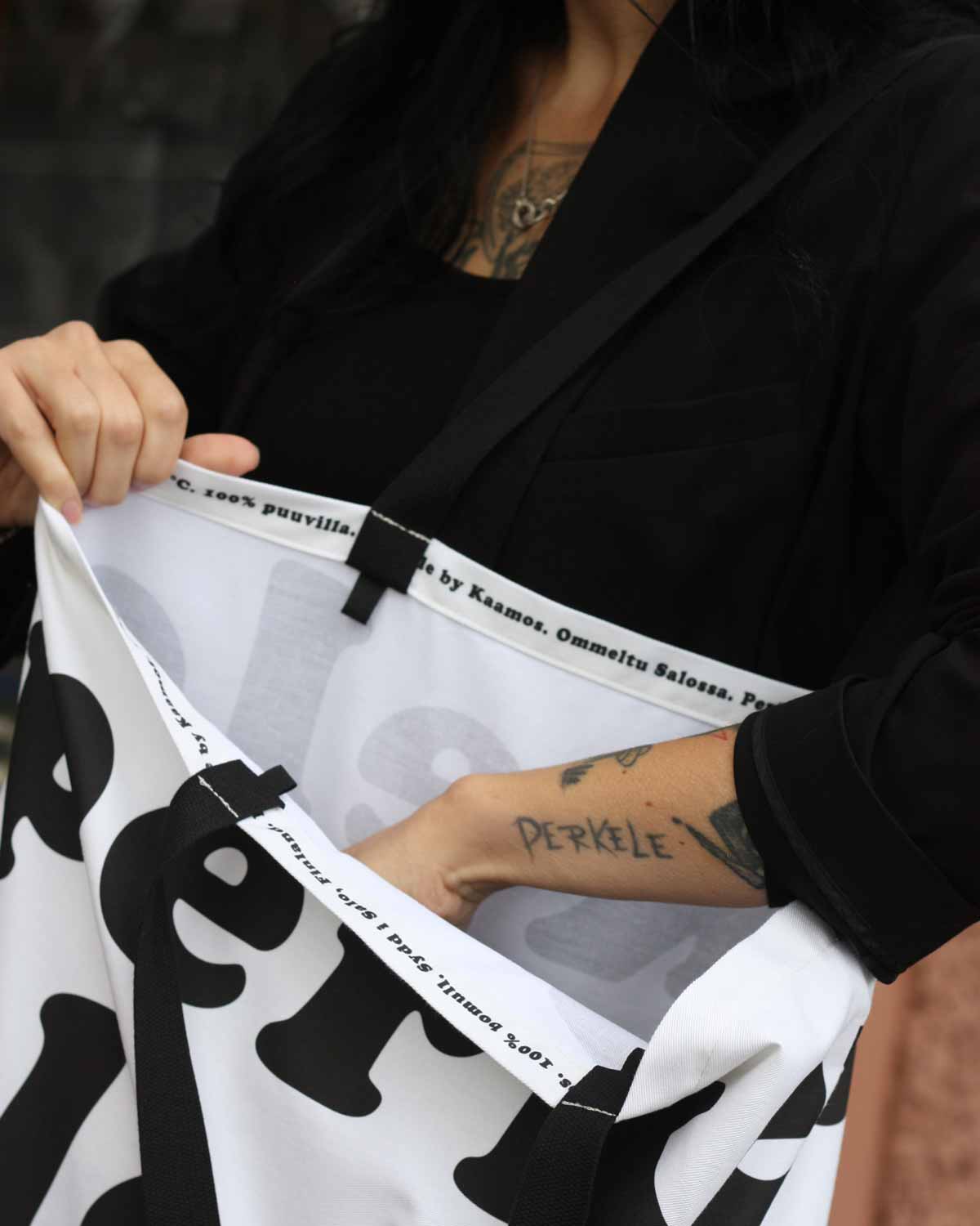 This oversized fabric tote bag is hand-sewn in Salo, Finland, in collaboration with a local partner. The Perkele fabric is an exclusive Kaamos design. The bag was created originally as a playful parody of the Finnish tote bag craze and has now transformed to be more edgy than ever!