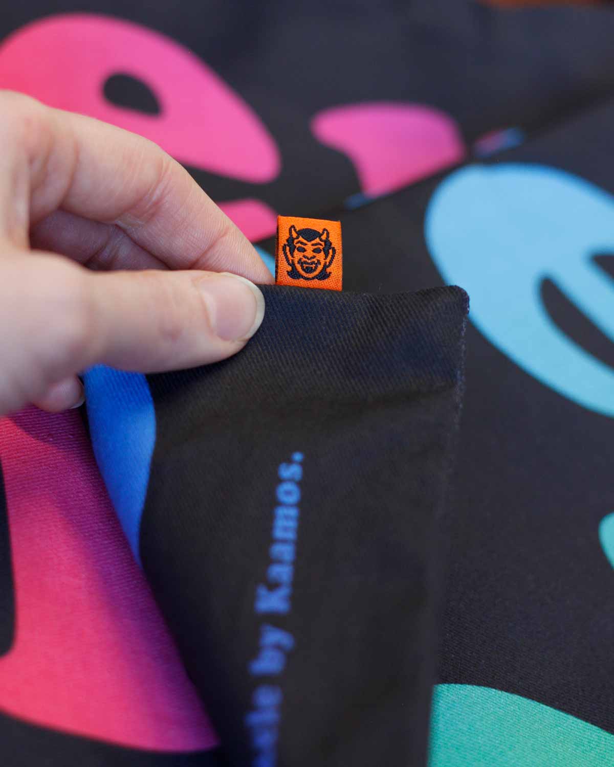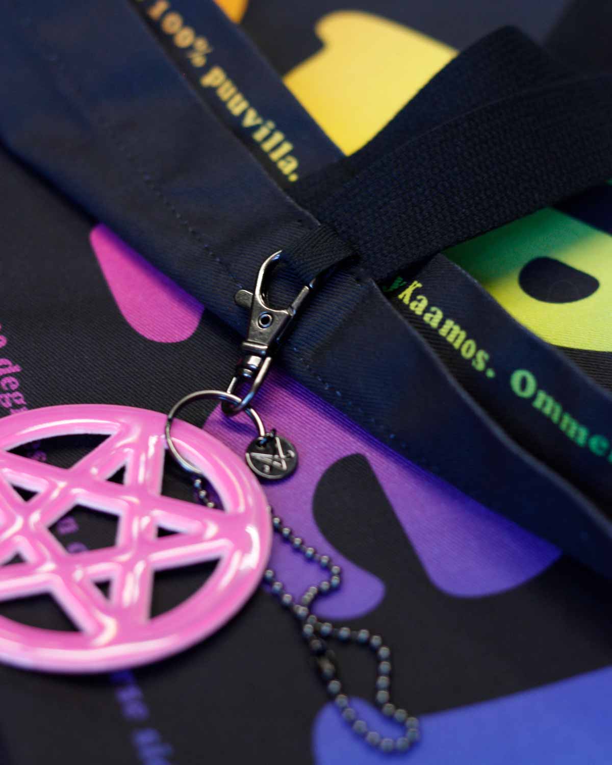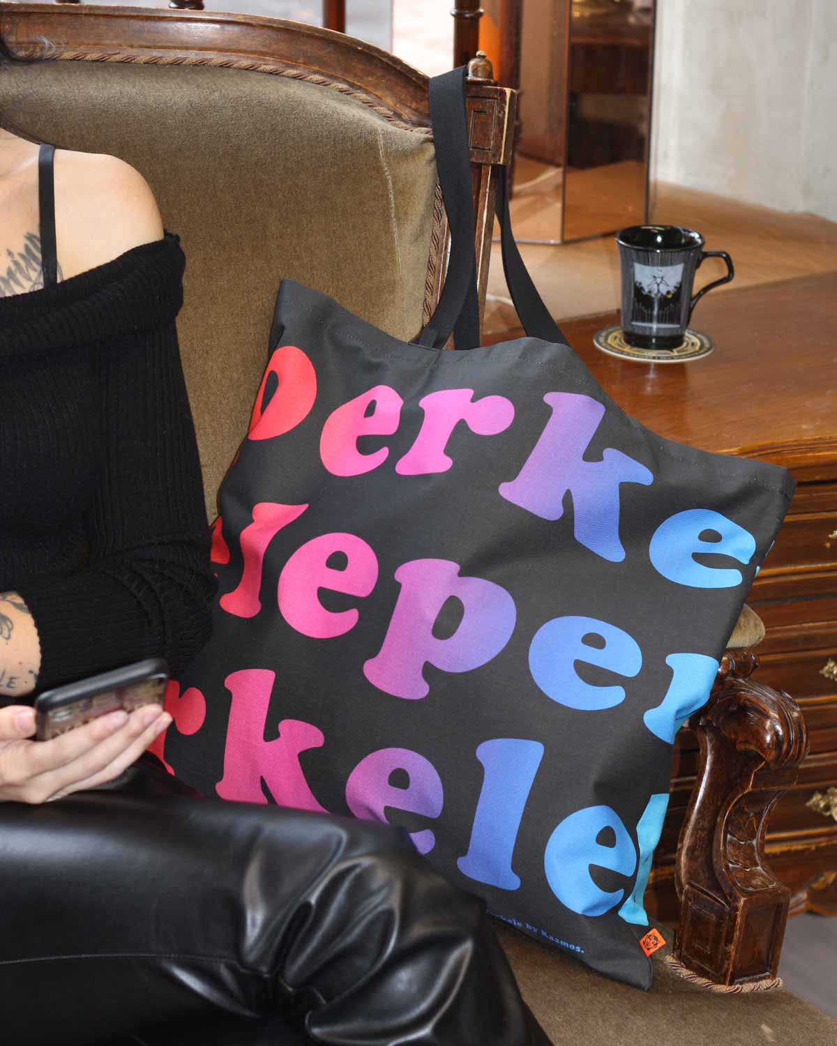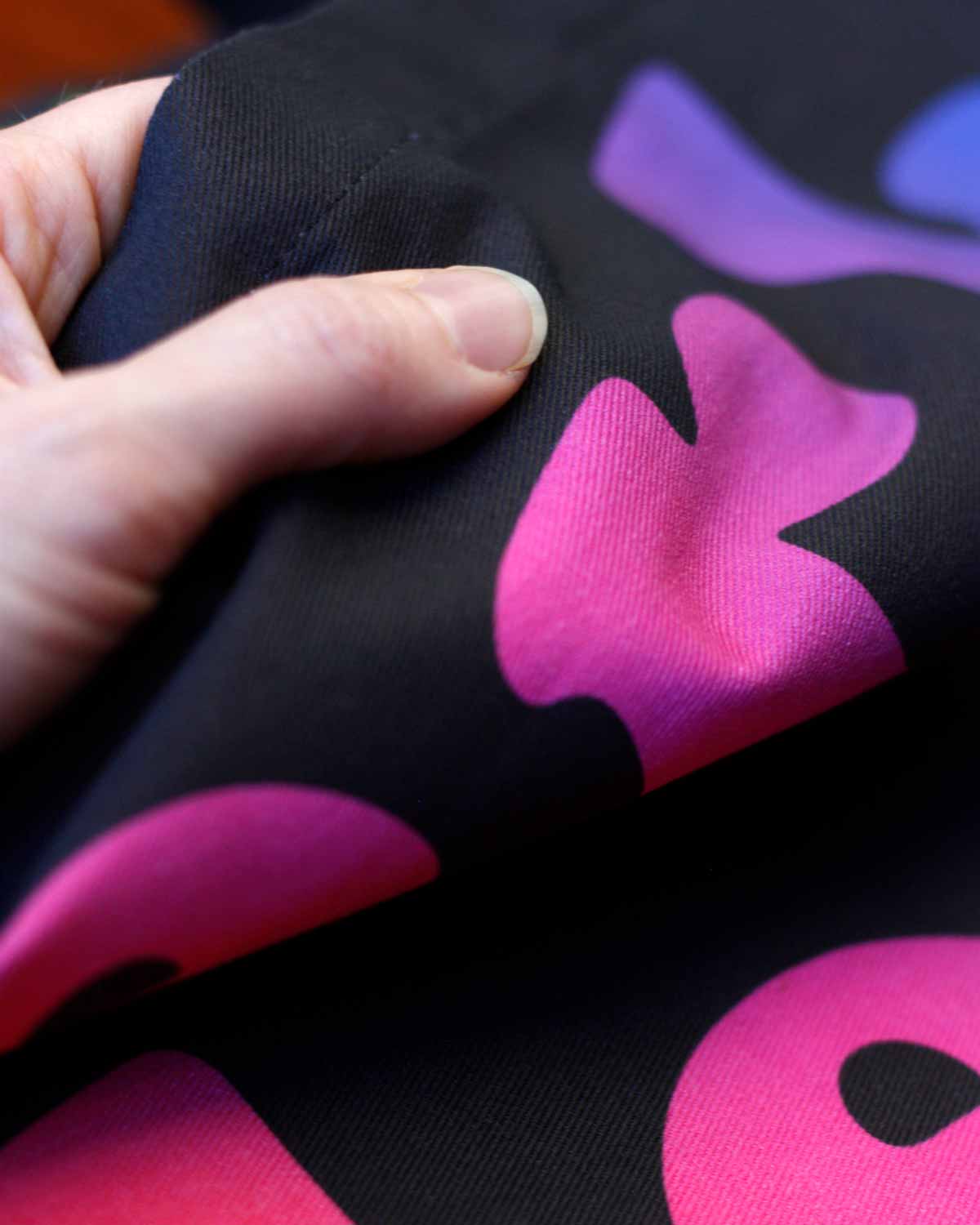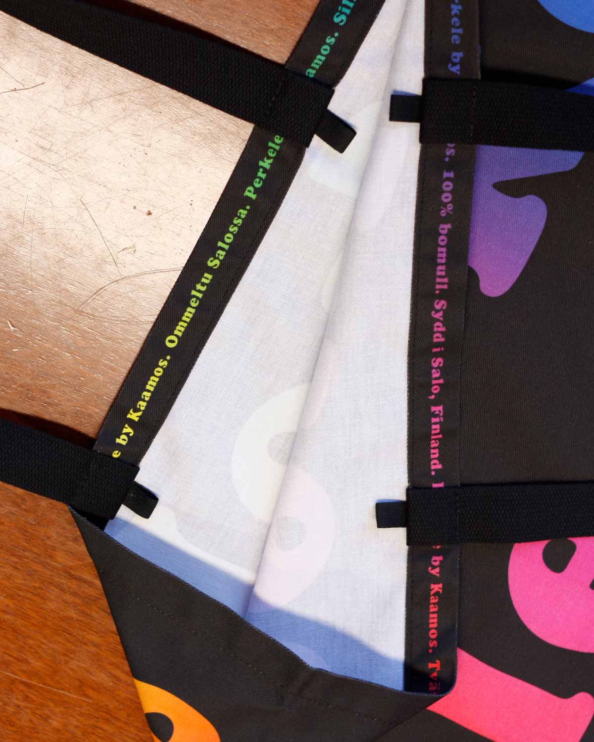 This oversized fabric tote bag is hand-sewn in Salo, Finland, in collaboration with a local partner. The Perkele fabric is an exclusive Kaamos design. The bag was created originally as a playful parody of the Finnish tote bag craze and has now transformed to be more edgy than ever!