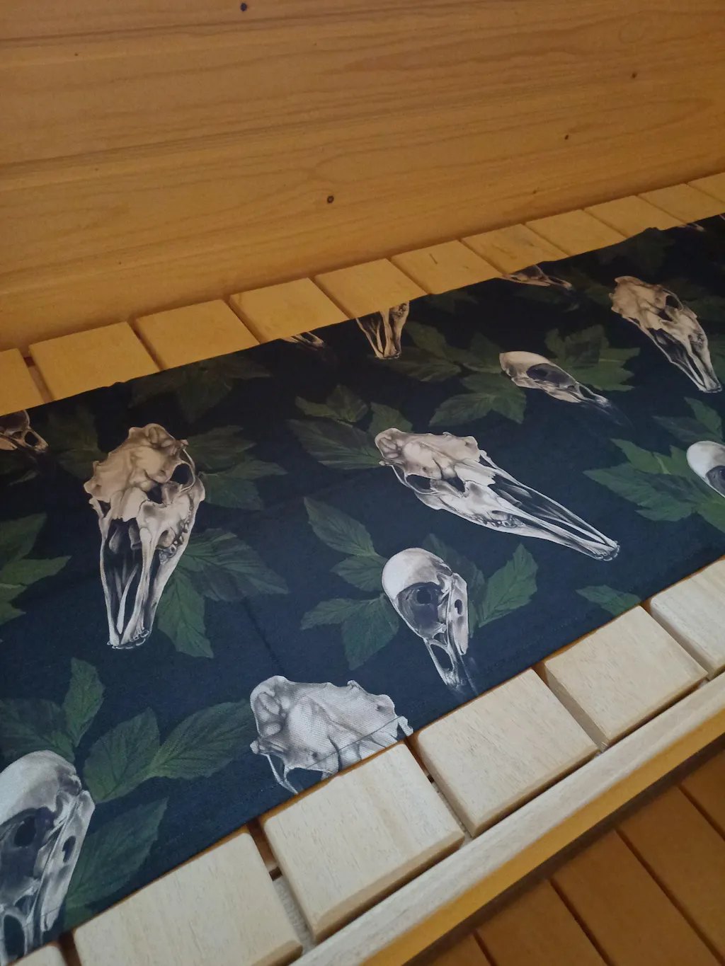 This beautifully grim large size sauna towel features a sauna themed animal skull pattern. Available in grayscale and in colour. The towel is especially designed to be used as laudeliina* in sauna. The cloth can be also used as a table cloth jus as well. The material is a blend of cotton and linen.